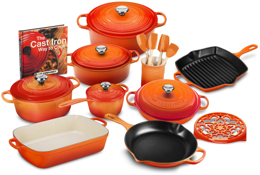 Enameled cast iron cookware provides even heat distribution and superior heat retention; colorful exterior enamel resists chipping and cracking